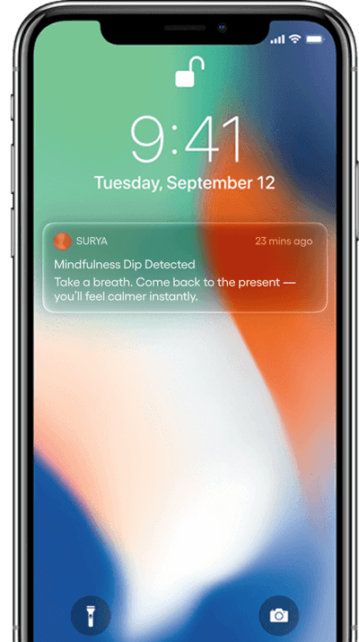 Even the most committed meditators lose presence throughout the day. Surya gently nudges you back when your mindfulness dips — a simple reminder to pause, breathe, and return to the present. Over time, these small resets add up, helping you carry mindfulness into every moment of life.